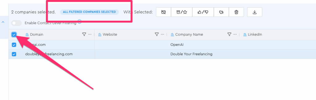 Note that the displayed number of selected companies is NOT the source of truth in “select all” modes.