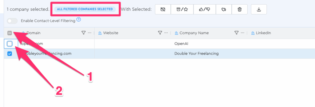 Once I’ve done that, the count at the top still says “2 companies selected,” even though our new filters mean only 1 is in the result set.