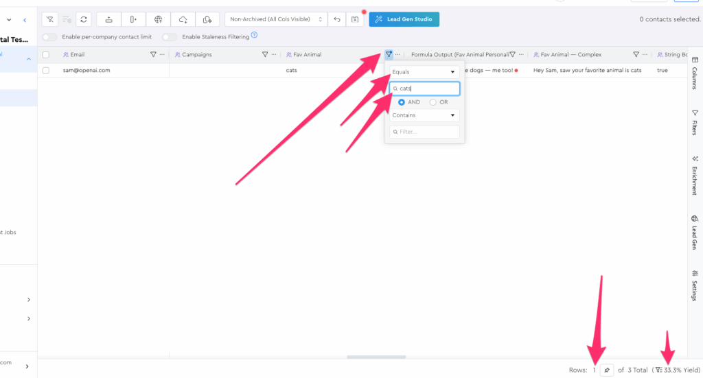 Let’s start by filtering our contacts grid to only show contacts whose fav animal is “cats.” You should just see Sam showing.