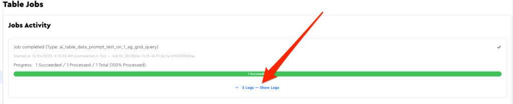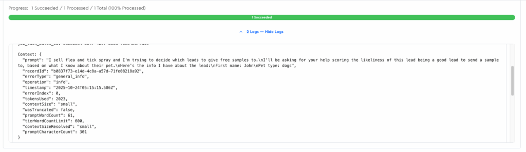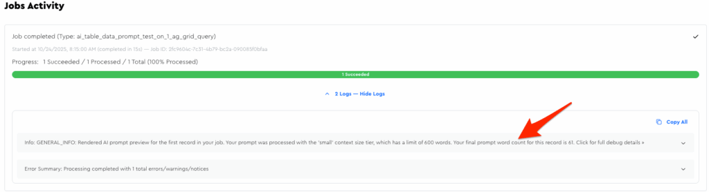 To aid your debugging and honing, you can go to the jobs page after running a prompt to see debug output for the first record from your job (I don’t log all of them because I don’t want to bloat my database with these large logs):
