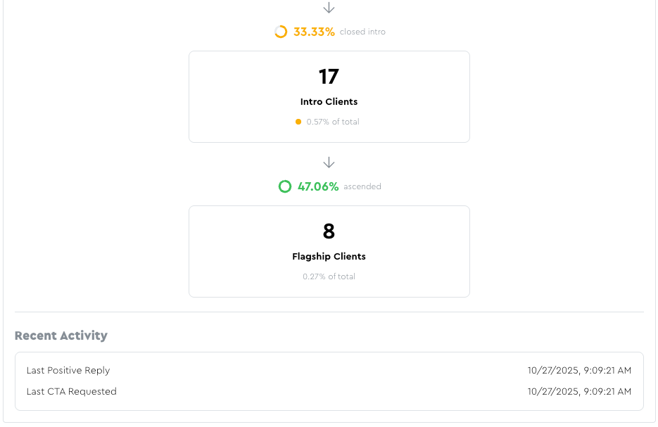 💭 Example: If 8 leads become clients for your intro offer and 4 of those clients buy your followup flagship offer, you have a 50% Flagship Offer Ascension Rate (4 flagship clients / 8 intro clients = 50%)