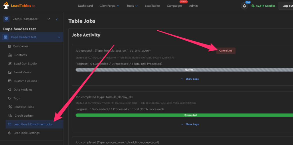 If you ever want to cancel an in-progress job, either due to it being stalled or you realizing you made a mistake with it, simply navigate to the jobs page from the sidebar of your LeadTable, find the job (probably at the top), and click the cancel button.