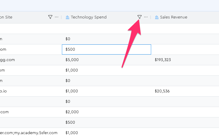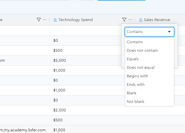 This will open the filter menu. If ever you run into something like the example below, where the filter options arenโt what youโd expect โ i.e. in this case we see text-oriented filters like โcontainsโ and no number-oriented filters like โgreater than,โ โless than,โ etc. โ it means you forgot to map this column to the correct type when uploading.
