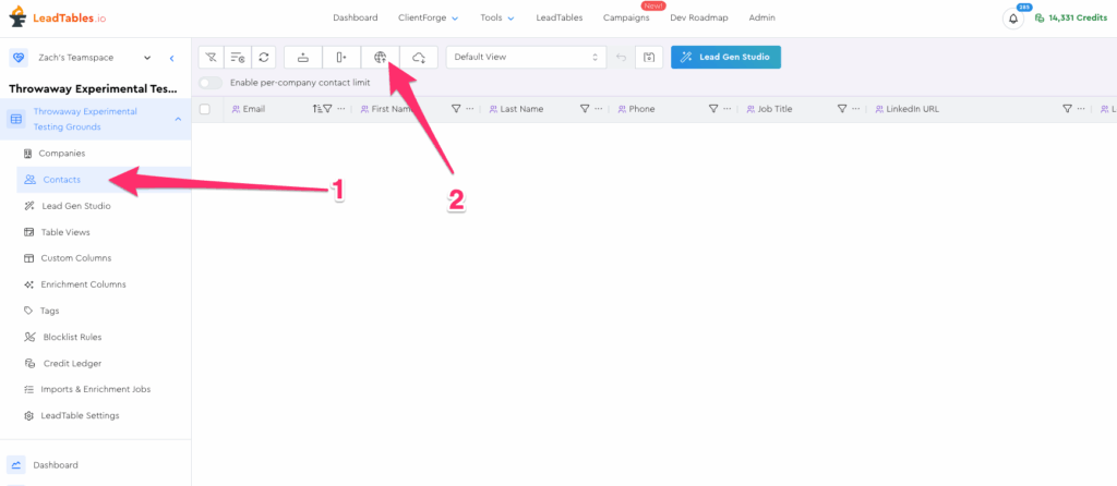 To start, go to the “Contacts” tab in the sidebar of your “Throwaway Experimental Testing Grounds” LeadTable. Then go to the uploader & choose “Upload Mode.”