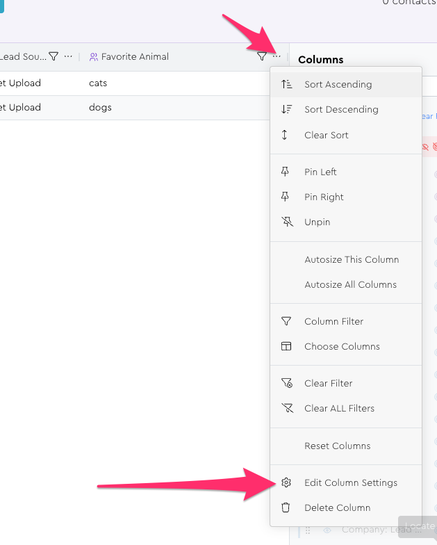 Now click the column settings icon (or just right click the column header) to open the column menu, and click the “Edit Column Settings” option