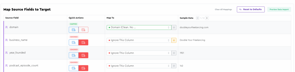 My defaults were pretty good, but I’m going to unmap the business name, since the domain is a better matcher anyway, and the business name is not a contact field (it’s a company field)