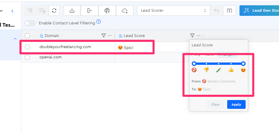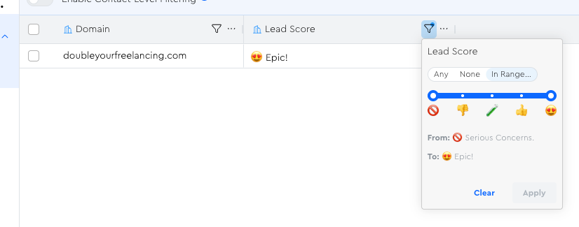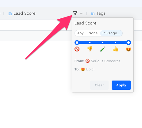 Once you’ve scored some leads, you can filter based on lead score in the Filters Tool Panel and in the grid:
