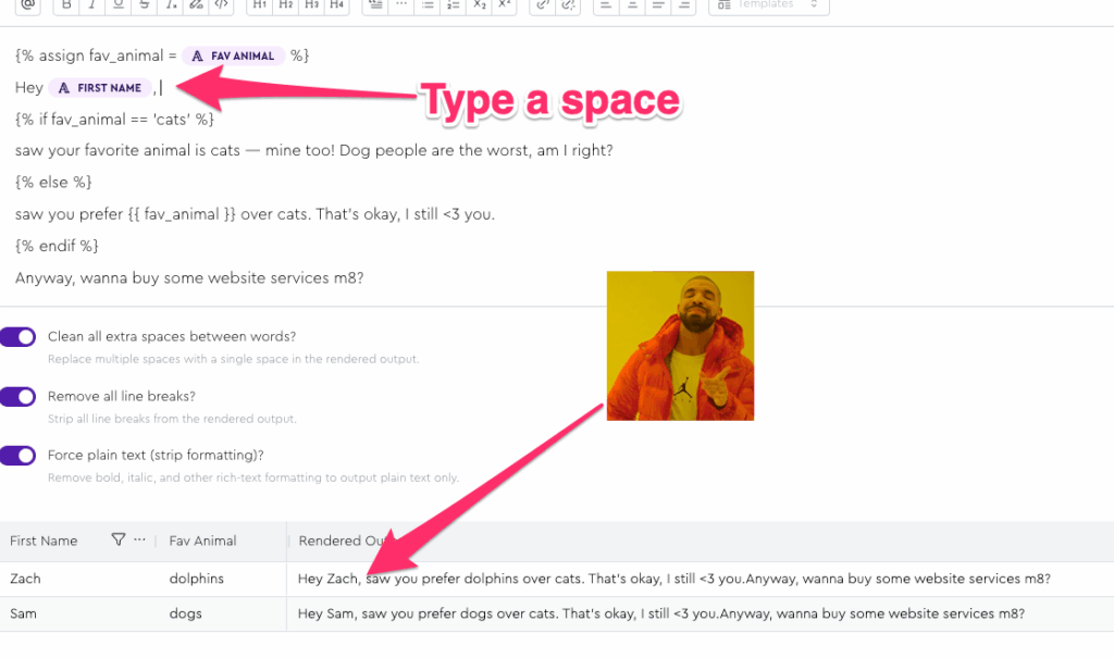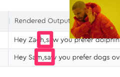 Simply type a space after “Hey [[contact:first_name]], “ and it should look good: