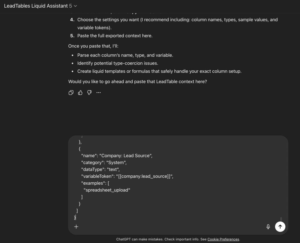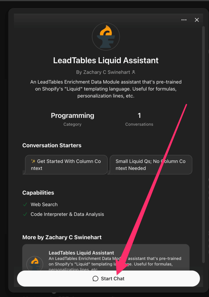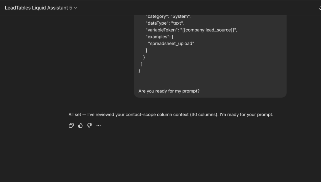 If you’re a ChatGPT user, you can load up the model directly from within the GPTs directory; it’s in there as “LeadTables Liquid Assistant”: