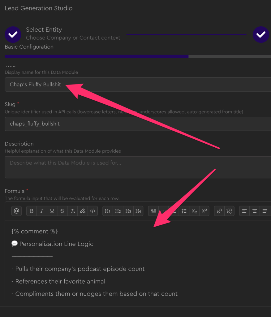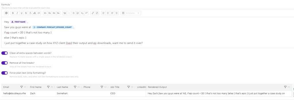 To test it, let’s open up the Lead Gen Studio (from within the contact table) and create a new formula. Let’s call it “Chap’s Fluffy Bullshit” and paste his code into it and see how the preview renders: