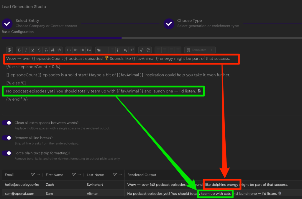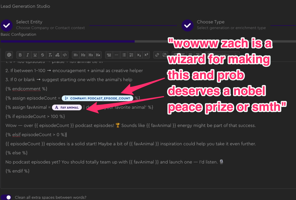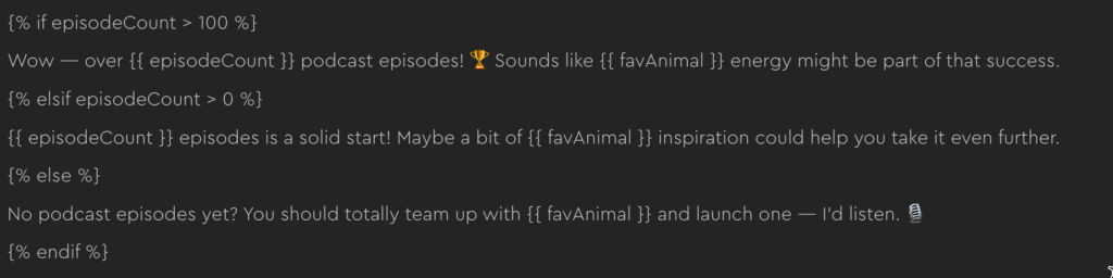 Now please write me a personalization line oriented around their number of podcast episodes and their favorite animal. Maybe we do a conditional where if they have over 100 episodes, we compliment them and suggest their favorite animal was part of that success, and if they have under 100 (but still have some) we mention that their fav animal could help them do more, and if they don't have any at all, we suggest that they could enlist the help of that fav animal to make one or something?