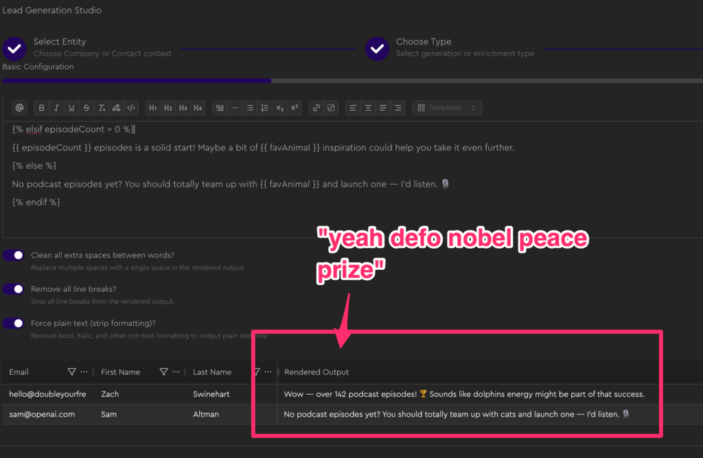 The proper way to do it is to write a solid “themeplate” with your human fingers, and have the AI rewrite it to match your lead’s data. (If you’re in $200KF we cover this in the Campaigns module in the copywriting section)