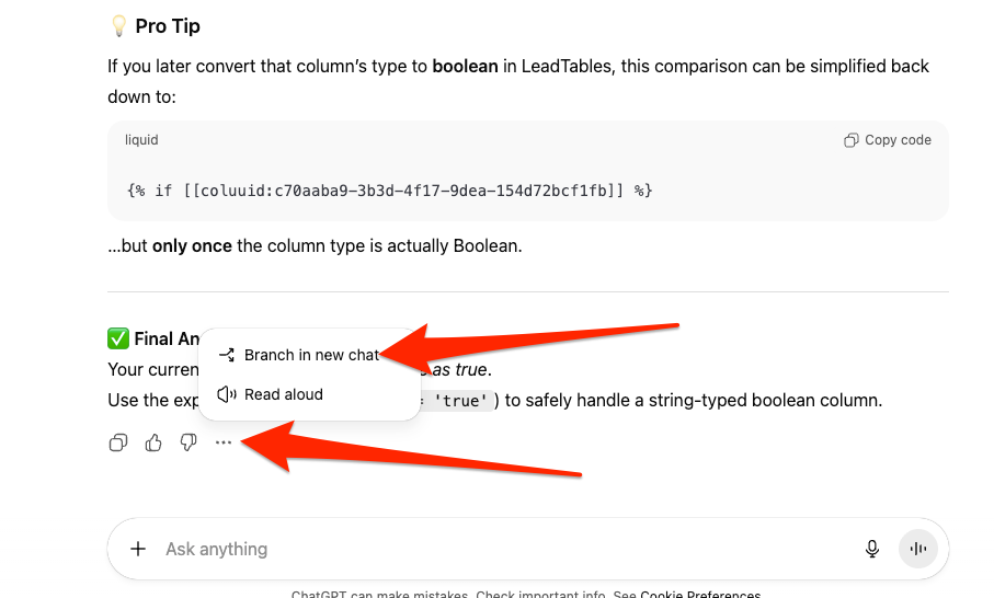 So what you can do to manage this get in the habit of branching into new chats early on, e.g. after sending your column context.