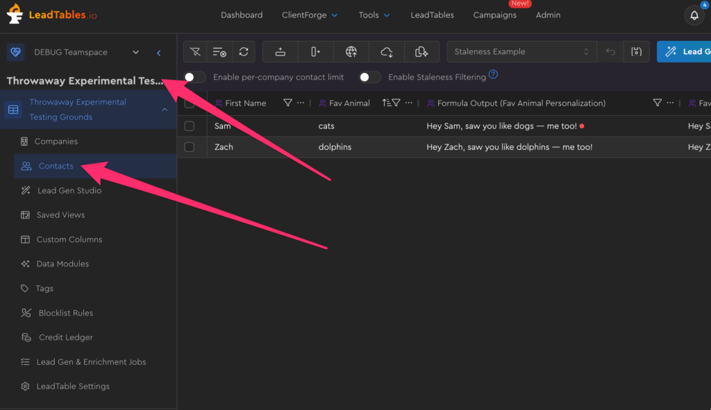 So let’s do those things! Go into the testing grounds LeadTable we’ve been using, and go into the Contacts page for it: