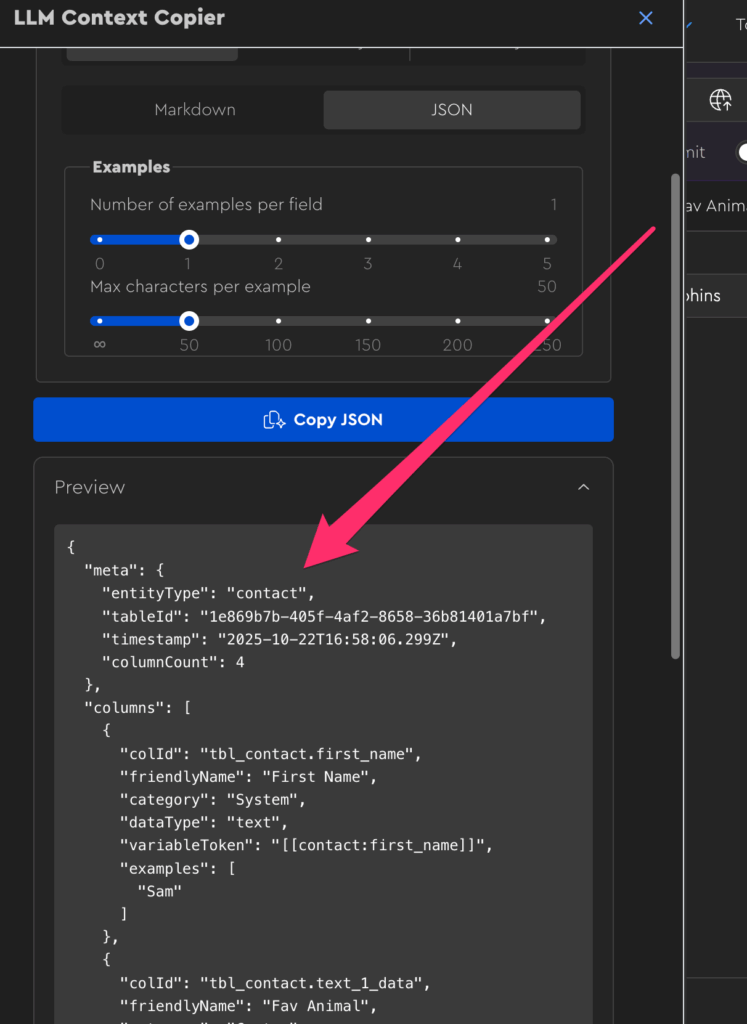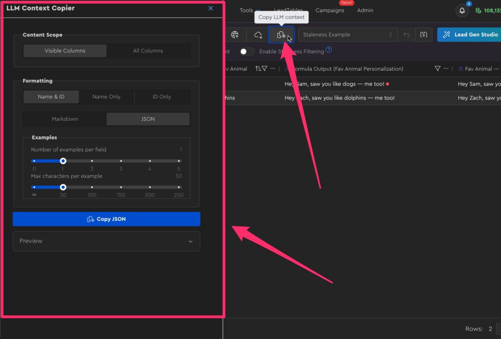 If you expand the Preview accordion at the bottom, you can see what’s going to get sent to the LLM when you copy it out — you can copy just the visible columns if you’re doing something that only needs visible columns, or copy out all columns to do more complex stuff, but at the cost of potentially diluted / bloated context due to the larger context size. Feel free to play with the options to see how they affect things.