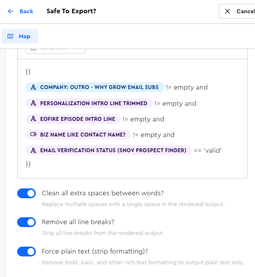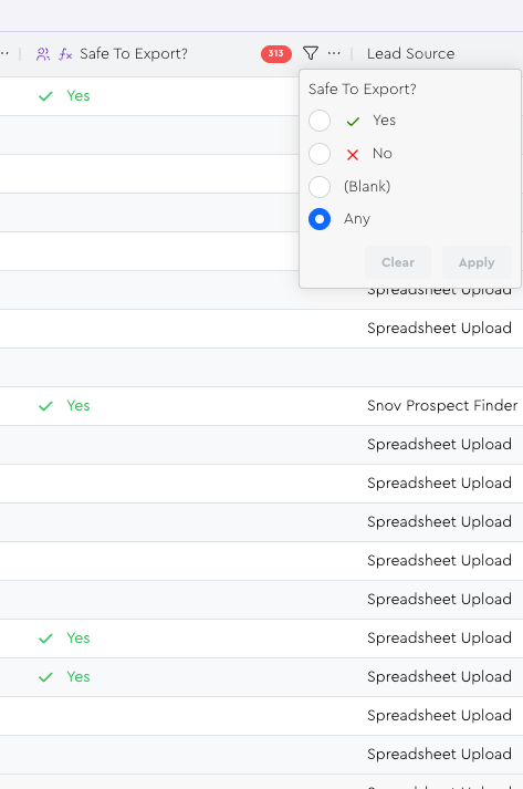 And since I have it outputting into a boolean column, I can easily filter by it to know if leads are all polished up and ready to be emailed, or if they still need some enrichment done for them first: