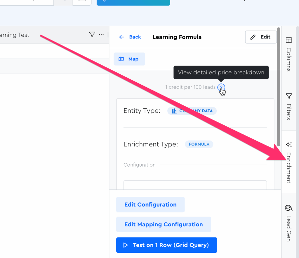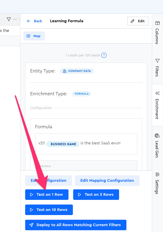 Let’s start by running it on just one lead. Open up your new formula in the Enrichment Tool Panel to get started: