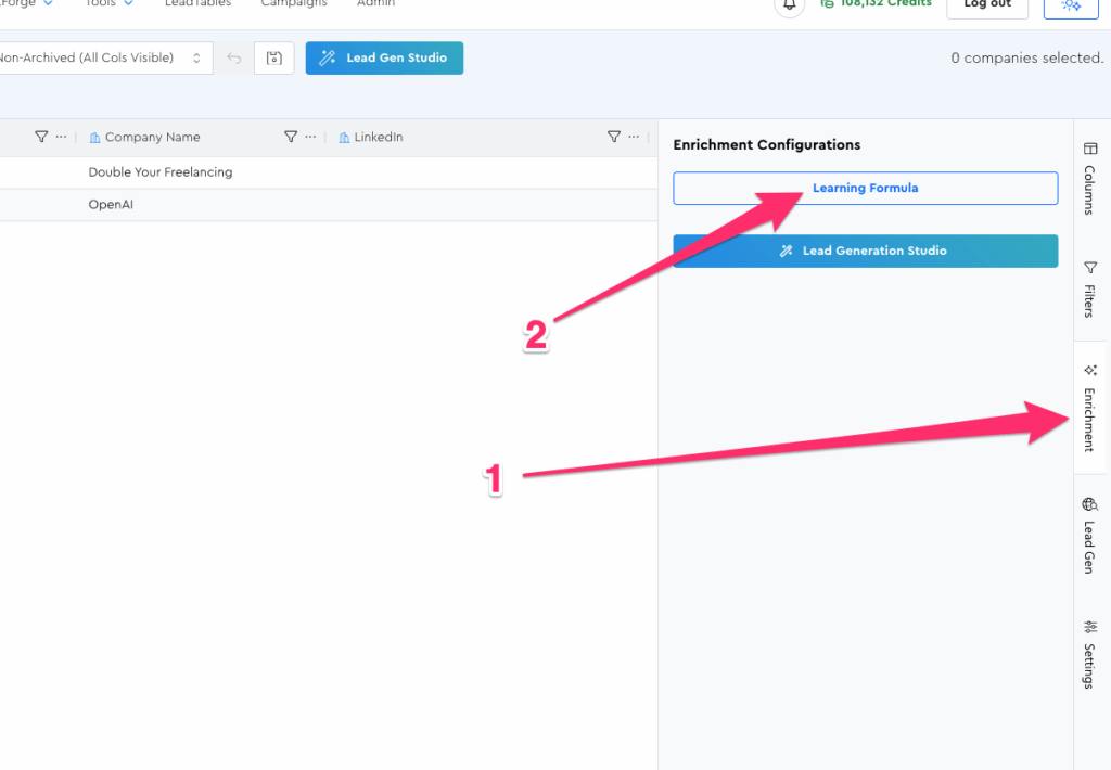 To run Data Module Operations, first click into the LeadTable, then navigate to your newly-created formula via the Enrichment Tool Panel.
