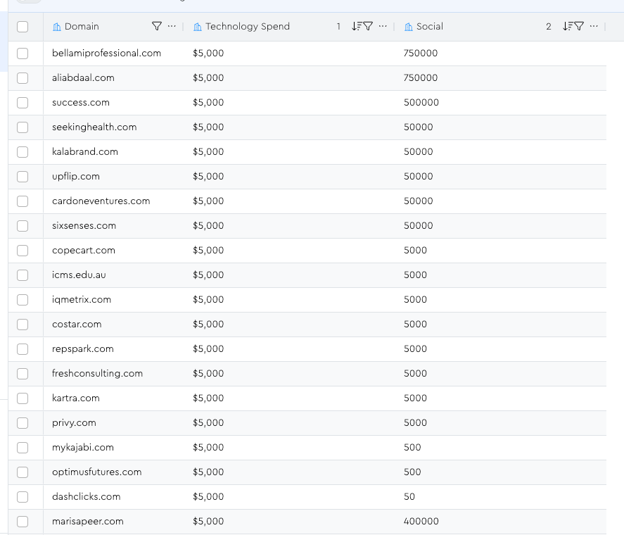 If you want to primarily sort descending on tech spend, then descending on social, first do the tech spend sort, then hold shift and click the “social” column twice while holding it.