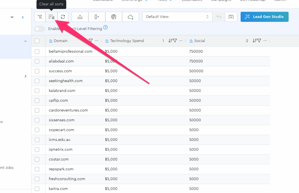 If you ever want to wipe ALL sorts on your LeadTable, you can use this button in the Action Bar: