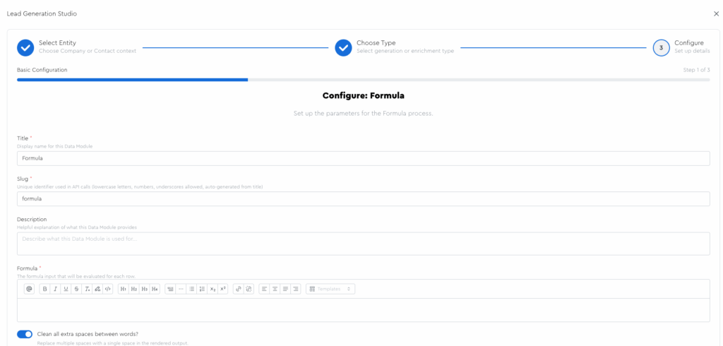 In the previous lesson, we chose a Formula Data Module and didn’t configure it yet. We should see something like this:
