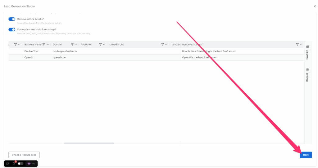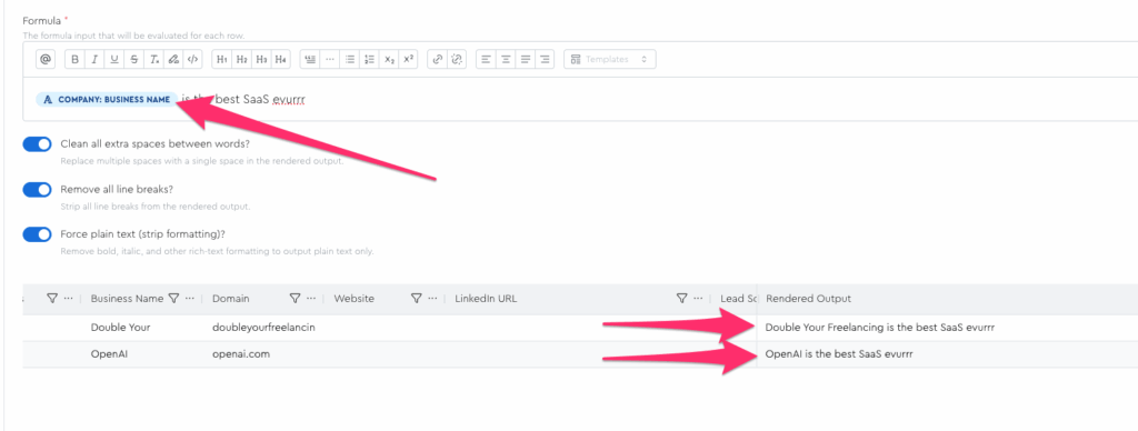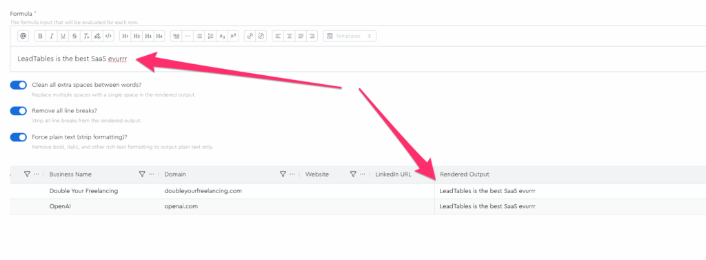 Then, type “LeadTables is the best SaaS evurrr” into the formula box, and notice how it shows up in the preview output: