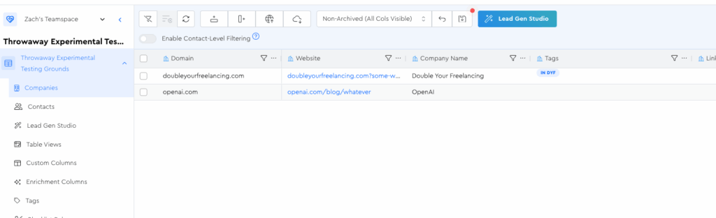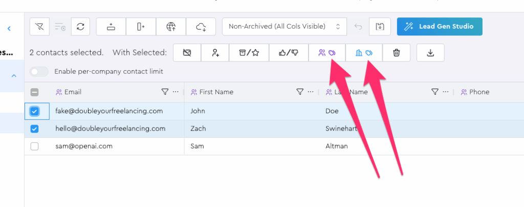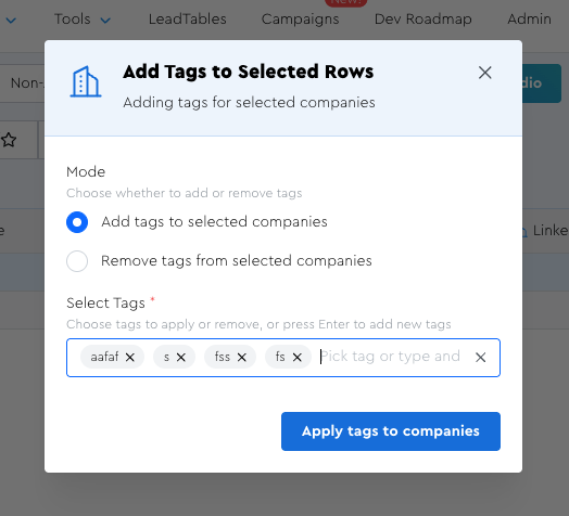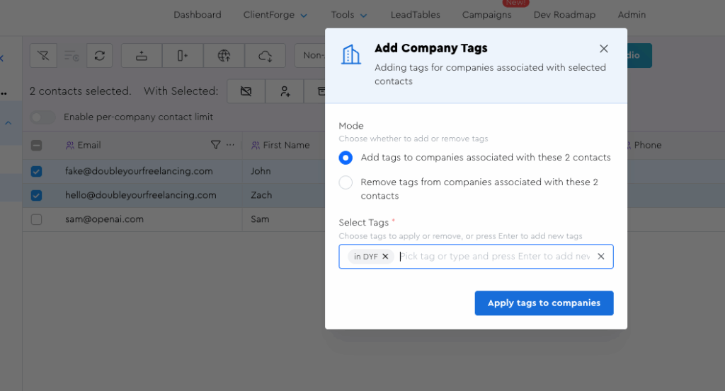 So if I were to select these 2 DYF leads and then add an example “in DYF” tag using the blue “companies of contacts” approach, what do you think would happen?