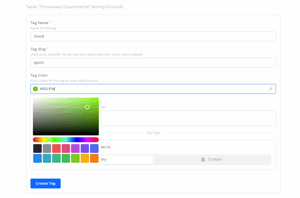 If you go to the Tags page in the LeadTables sidebar, you can edit even more details, including color, description, etc.