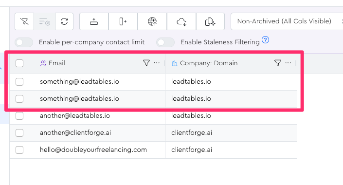 When you’re uploading lead data, I have tooling built in to the platform to help you avoid this, but it’s technically allowed for now because there may be certain scenarios where someone could want an email or domain in their table multiple times for different leads.