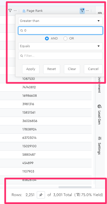 In the screenshot above, we filtered by “page rank greater than 0” and got a 75% yield.
