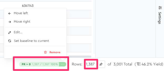 Now, if you adjust your filters (add more, remove some, whatever), you’ll be able to see your current list size relative to what it was when pinned