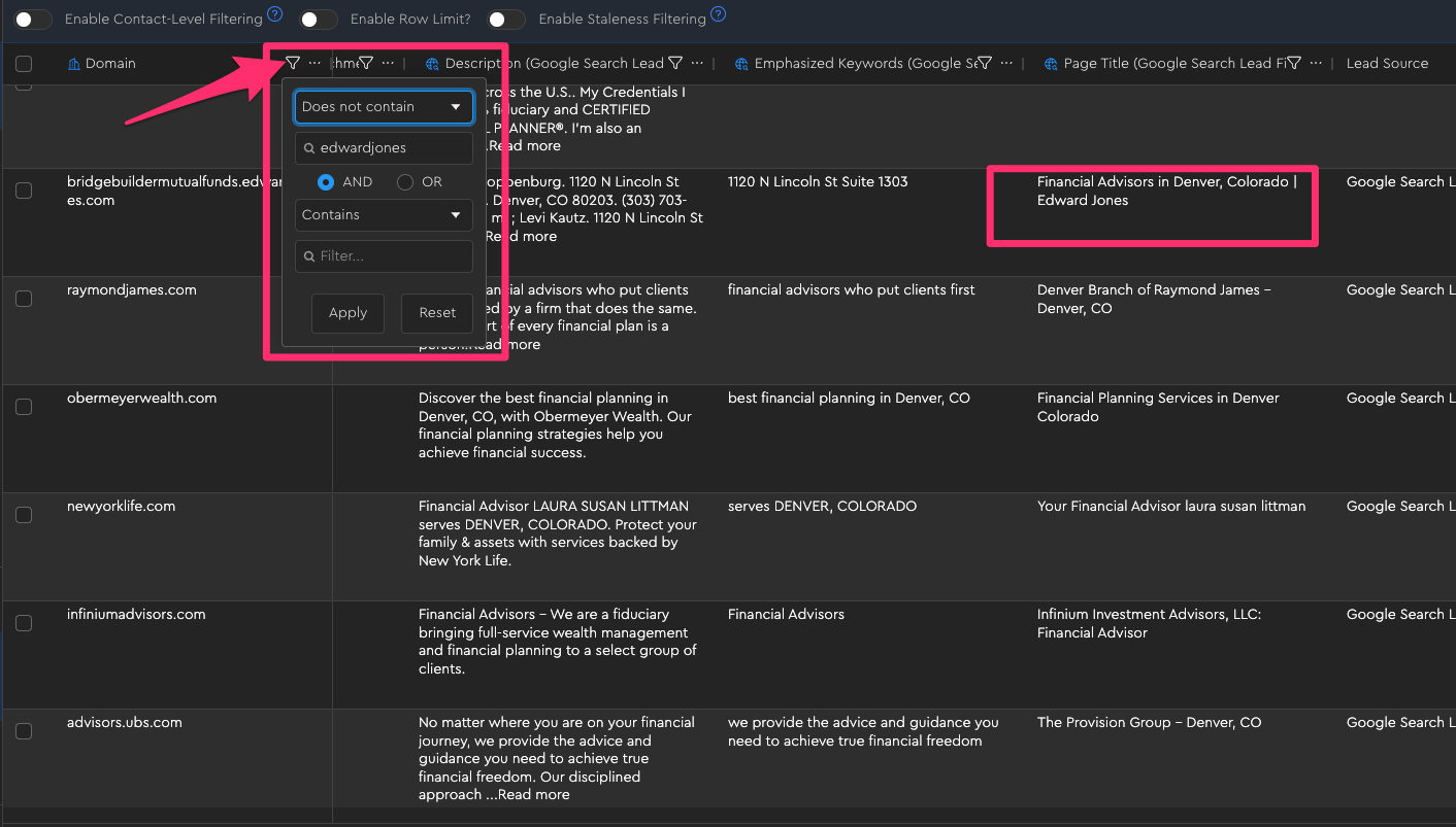 For example, if I want to find independent financial advisors who aren’t part of a big chain like Edward Jones, I could do that as a filter on the domain field: